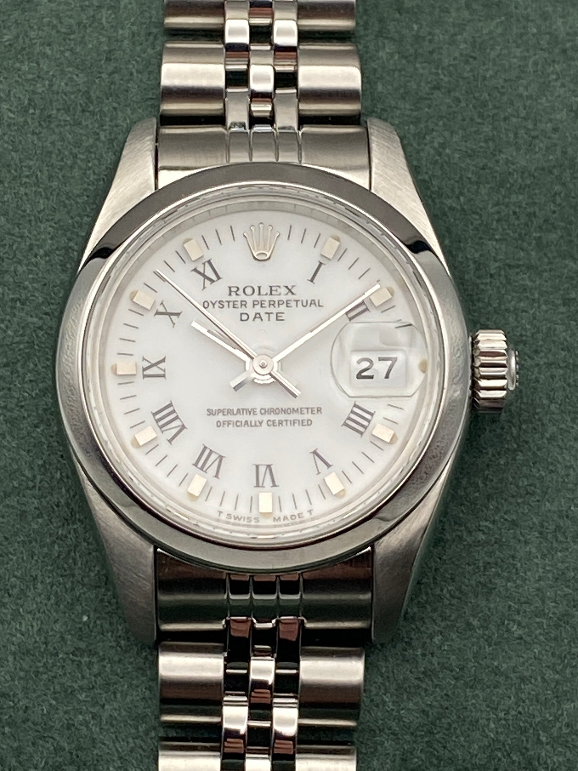 This elegant 26 mm Lady-Datejust features a smooth steel bezel, a clean white Roman dial, and a later-supplied Rolex Jubilee bracelet in excellent condition.